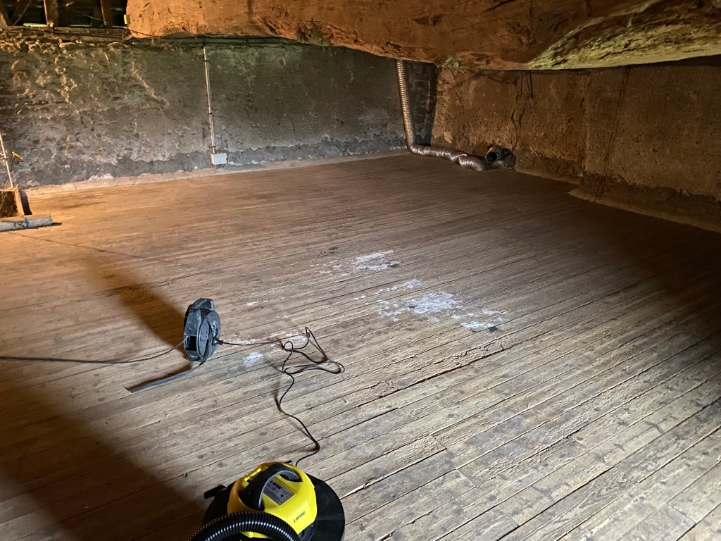 Two days were spent clearing mysterious animal dropping (masks and gloves were in use) both by sweeping and vacuuming. Now we have a relatively blank slate to lie “frein-vapeur”/”pare-vapeur” moisture barrier film and then about 40cm of natural insulation (hemp and recycled cotton etc) recommended by our construction-savvy neighbor. He will build a trap door to further close off the attic. Then it’s off to saving on heating bills, albeit probably 10 years before seeing a return on investment so… let’s focus on the environmental savings instead!